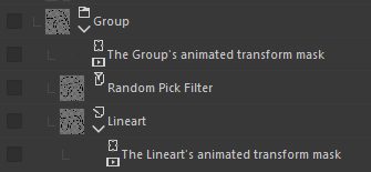 I'm using the Animation Curves feature for this. I use a transform mask on the lineart for the noise shifting, and a transform mask on the whole group for the cancellation.
