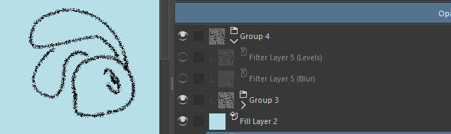 I should give a warning that the way I do it is convoluted and tricky. Someone could probably write a shader and make a better version (I considered exporting my lineart to blender or unity and doing shaders there, but having it all in Krita is more convenient for me)